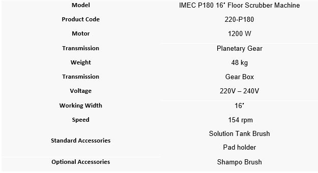 Top > Products > Cleaning Machines > FLOOR SCRUBBER/ BUFFER MACHINES > IMEC P180 16″ Floor Scrubber Machine