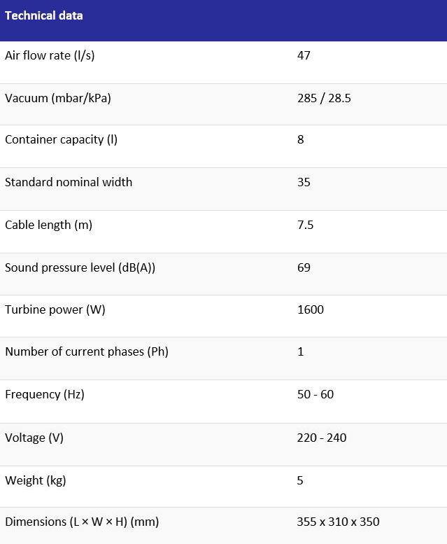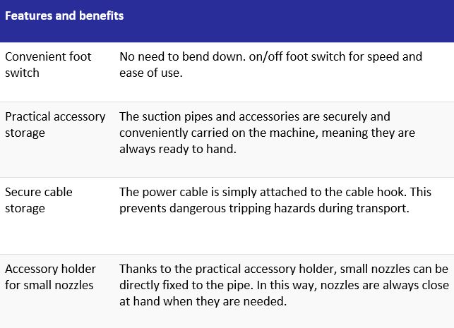 The T 8/1 Classic lightweight and robust dry vacuum cleaner with 8 litre catch pan combines high operating comfort with powerful suction and a very good price-performance ratio. Ease of use and high suction power combined in one machine! The surprisingly affordable T 8/1 Classic dry vacuum cleaner offers excellent cleaning performance and an 8 litre catch pan for long work intervals. This lightweight machine uses a highly practical operating concept for ease of use. A large foot switch and practical suction tube holder are only a few examples of this convenience concept. In addition, the suction power can be conveniently adjusted to suit the particular cleaning task and the ergonomic handle and robust chassis with 2 smooth-running wheels and steering rollers allow easy transport over steps or long distances. Filter bag replacement is also quick and easy thanks to two flaps on the turbine head. A large permanent filter of washable nylon ensures efficient dust separation.
